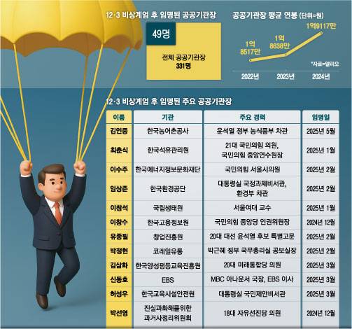 또 같은 기간 공고가 나간 뒤 선임까지 이어진 공공기관장은 49명에 달한다. 이 가운데 윤 전 대통령이 파면된 지난달 4일 이후 임명된 기관장은 9명이다. 전체 331곳에 달하는 공공기관장 가운데 15%가 최근 반년 간 국정 혼란기에 신규 선임된 셈이다.