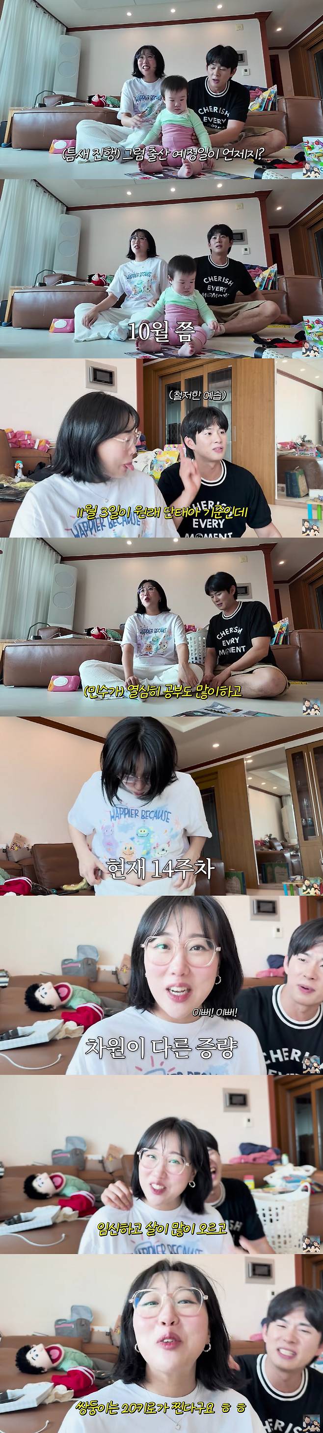 현재 임신 14주차라는 임라라는 "예정일은 10월이다"라고 했고, 손민수는 "원래 11월 3일이 단태아 기준인데, 쌍둥이라서 10월이다. 공부 열심히 하고 있다"라며 설레는 마음을 감추지 못 햇다.