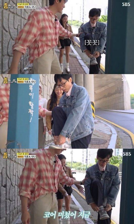 유재석, 유연석은 틈 친구 지효, 사나와 함께 사연자를 만나러 이동했다. 이동하던 중 유재석의 신발끈이 풀렸고 유재석은 허리도 굽히지 않고 다리를 든 상태에서 신발끈을 묶었다.