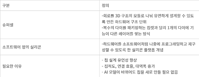 슈퍼셀은 각 반도체 기능을 담당하는 회로층(레이어)을 수직 적층하는 것이 골자다. 서로 다른 반도체(다이)를 연결하는 '칩렛'과 유사하지만, 슈퍼셀은 이를 회로 층 단위로 더욱 세분화했다. 회로층을 모듈 형태로 구성, 설계를 쉽게 바꾸기 위해서다.