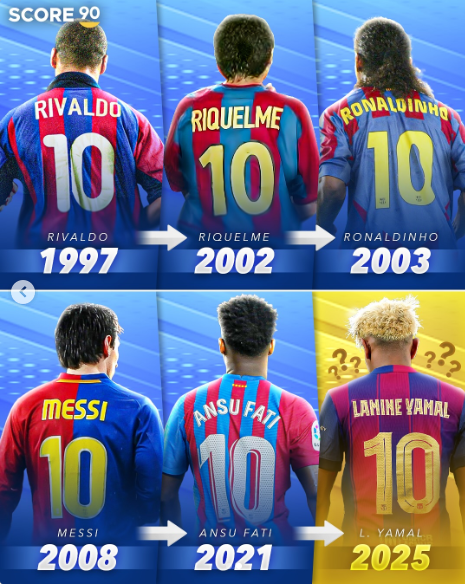 이런 상황에서 ‘스코어 90’은 바르셀로나 최근 10번의 주인공들을 주목했다. 1997년에 히바우두를 시작으로 2002년 리켈메, 2003년 호나우지뉴, 2008년 메시, 2021년 안수 파티 그리고 2025년에 야말이 될 것이라는 예상이다.