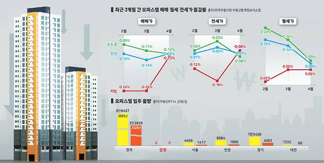 오피스텔 매매·전세 시장은 위축되고 있다. 한국부동산원의 ‘4월 오피스텔 가격 동향조사 보고서’에 따르면 전국 오피스텔 매매가격은 한 달 전보다 0.12% 하락했다. 2022년 7월부터 34개월 연속 내리막이다. 이 기간 매매가 누적 감소폭은 6.25%에 달한다.