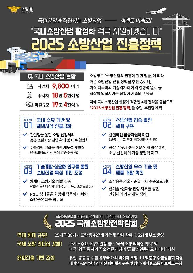 소방청은 이날 이 같은 국제소방안전박람회 추진 계획과 함께 올해 소방 산업 진흥 정책도 발표했다. 올해 정책은 △국내 수요 기반 및 해외 시장 진출 강화 △소방 산업 지속 발전 체계 구축 △소방 산업 육성 기반 조성 △소방 산업 우수 기술·제품 개발 촉진이라는 4대 전략으로 수립됐다. 개발도상국 소방 차량 무상 양여 등 공적원조개발(ODA) 사업을 통한 국제 협력과 해외 인증 획득 등 수출 역량을 강화하고, 소방산업공제조합의 보증 수수료 인하, 이자 비용 지원 등 지원책을 마련해 산업 발전을 돕는다.
