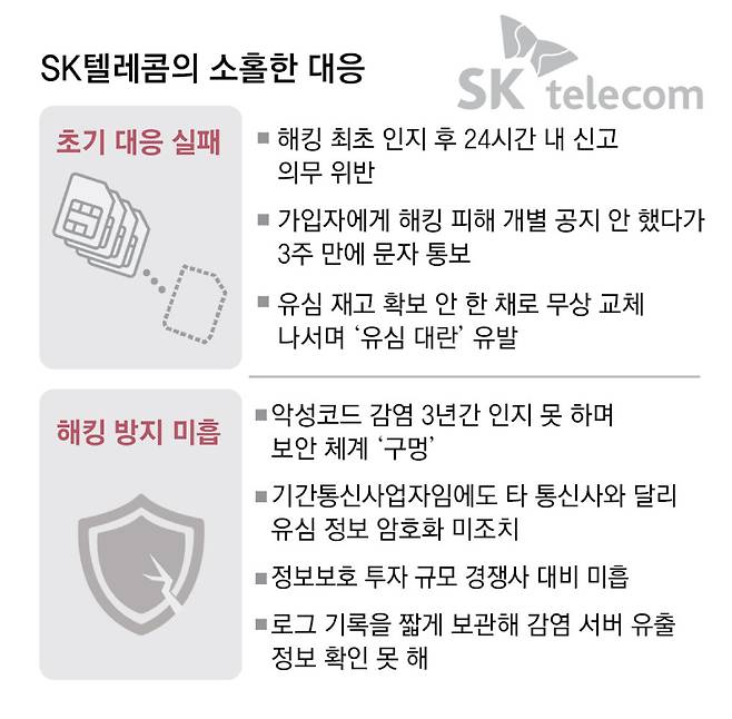 최초 해킹 사실 신고 지연부터 ‘유심 대란’ 사태 초래까지 해킹 사태를 수습하는 과정 전반이 허점투성이였다는 비판도 나온다. SK텔레콤은 지난달 18일 이상 징후를 최초로 파악했으나 침해 사고 확인 24시간 이내 신고해야 한다는 규정을 어기고 뒤늦게 한국인터넷진흥원(KISA)에 신고했다.