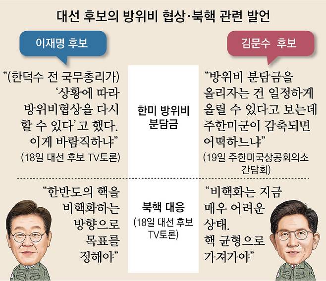 이 후보와 김 후보는 한미 방위비 분담금 인상 여부에 대해 엇갈린 입장을 보이고 있다. 이 후보는 한미 방위비 분담금 재협상 자체에 부정적인 반면 김 후보는 재협상을 통한 인상 가능성을 시사했다. 북한 핵 문제 대응에 있어서도 이 후보는 “대화를 통한 단계적 비핵화”를 주장하고 있고, 김 후보는 “핵 억제력 강화를 통한 핵 균형”이 필요하다는 입장이다.