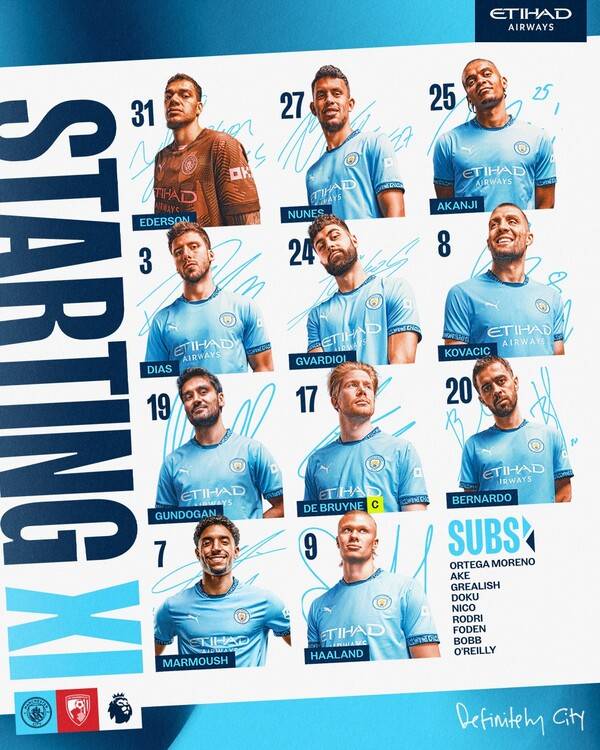 맨시티가 총력전을 펼친다. 부상에서 회복한 로드리가 교체 명단에 이름을 올리고, 홀란드, 마르무쉬, 실바, 더 브라위너, 귄도안, 코바시치, 그바르디올, 디아스, 아칸지, 누네스, 에데르송이 선발로 나선다. 더 브라위너는 이날 마지막 홈경기에서 주장 완장을 차고 나선다.