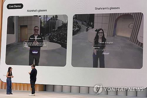 Nishtha Bhatia, Product Manager at Google, Glasses & AI, bottom left, and Shahram Izadi, Android XR Platform & Products, speak at a Google I/O event in Mountain View, Calif., Tuesday, May 20, 2025. (AP Photo/Jeff Chiu)