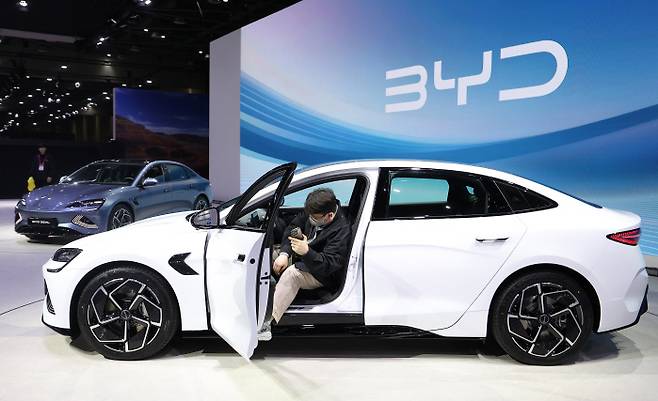[지난 4월3일 경기 고양시 킨텍스에서 열린 '2025 서울모빌리티쇼' 미디어 데이에서 선보인 BYD의 전기차 (사진=연합뉴스)]