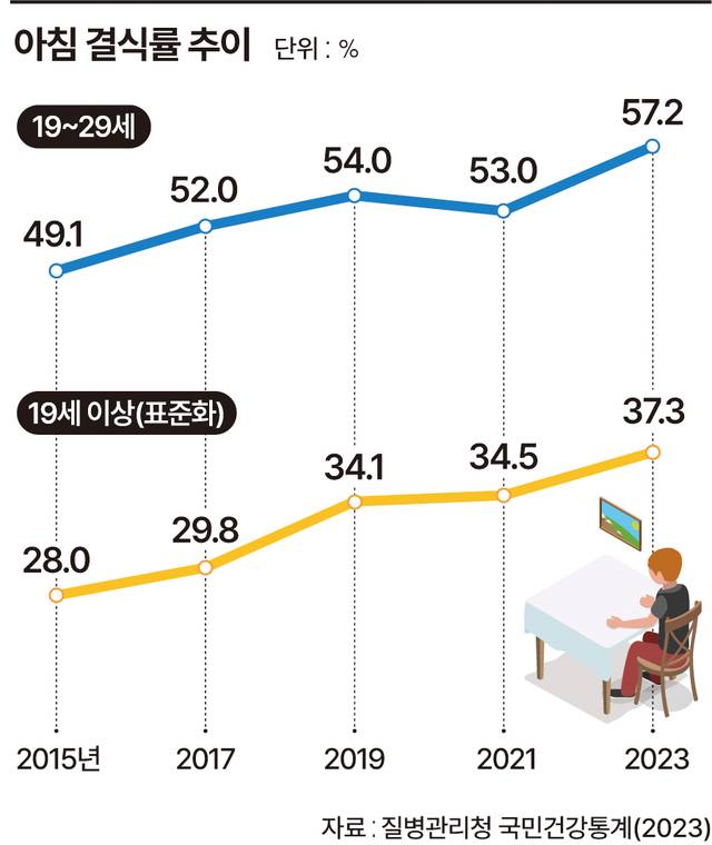 질병관리청의 ‘2023년 국민건강통계’에 따르면 한국 남성의 아침 결식률은 2014년 25.7%에서 2023년 35%로, 여성은 22.2%에서 34.1%로 늘었다. 특히 지난해 기준 19∼29세 청년층의 아침 결식률은 57.2%로 다른 연령대에 비해 유독 높았다.