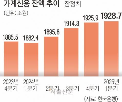 한국은행이 20일 발표한 ‘2025년 1분기 가계신용(가계부채)’ 통계에 따르면 국내 가계부채는 3월 말 기준 1928조 7000억원으로 지난해 말(1925조 9000억원)보다 2조 8000억원 증가해 2002년 4분기 관련 통계 공표 이래 최대 규모를 기록했다. 가계부채는 은행·보험사·대부업체·공적 금융기관 등에서 받은 대출에 신용카드 결제 전 사용액(판매신용)을 더한 것으로 포괄적인 가계빚을 의미한다.