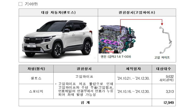 21일 국토교통부에 따르면 기아는 셀토스와 스포티지 2개 차종 1만2천949대를 리콜한다. 이들 차량은 고압 파이프 제조 불량으로 고압 파이프와 고압 펌프, 연료 레일 연결부에서 연료가 누유돼 화재 발생 위험이 있는 것으로 확인됐다. 리콜 대상은 지난해 10월 16일부터 12월 30일까지 생산된 차량으로, 기아는 오는 28일부터 시정 조치를 진행할 예정이다.
