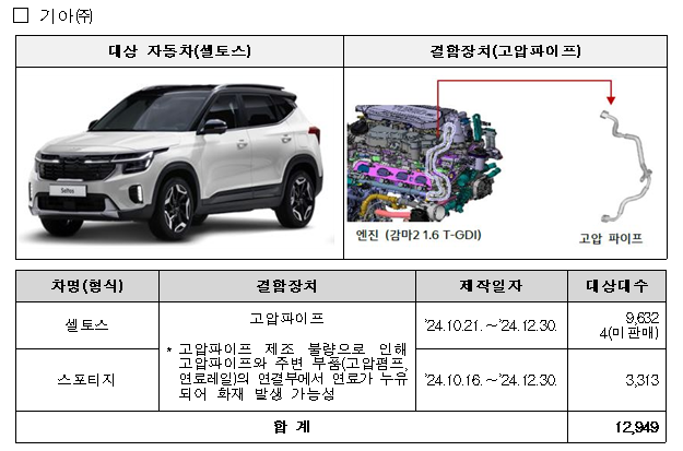 기아의 경우 셀토스 등 2개 차종 1만 2949대는 고압파이프 제조 불량으로 인해 고압파이프와 주변 부품의 연결부에서 연료가 누유돼 화재가 발생할 가능성이 발견됐다. 이에 28일부터 시정조치를 진행한다.
