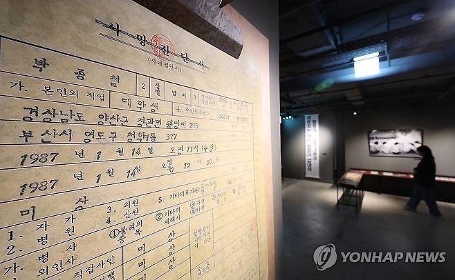 (서울=연합뉴스) 이진욱 기자 = 1970-80년대 국가 폭력의 상징이었던 남영동 대공분실이 민주화운동기념관으로 재탄생한다. 민주화운동기념사업회(이사장 이재오)는 오는 6월 10일 민주항쟁 38주년을 맞아 정부 기념식과 함께 기념관 개관식을 개최할 예정이다. 사진은 20일 민주화운동기념관에 전시된 박종철 고문치사 사건 관련 문서. 2025.5.21