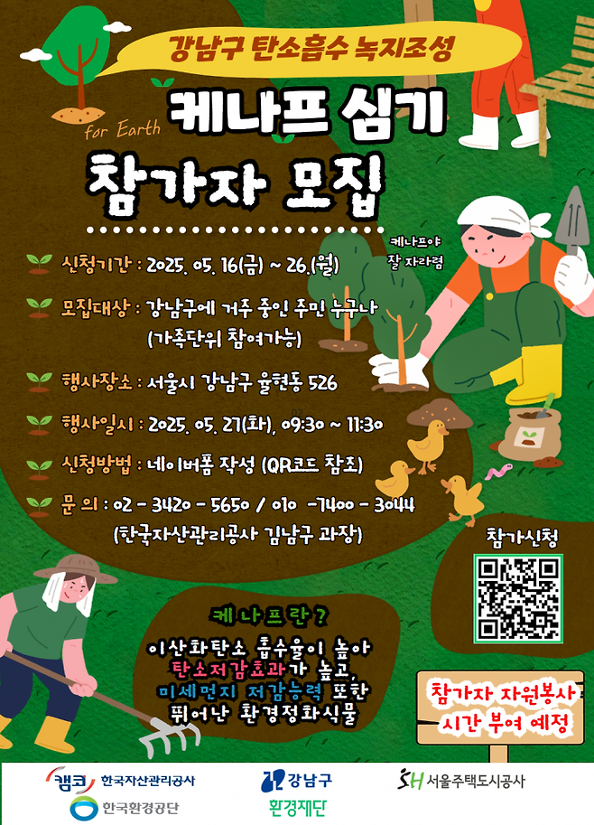 강남구는 지난 20일 한국자산관리공사, 서울주택도시공사, 한국환경공단, 환경재단 등 5개 기관과 업무협약을 맺고, 이달 내로 케나프를 심는다. 각 기관은 유휴 국유지를 녹지로 조성하고, 탄소중립과 지역 환경보호 문화 확산, 시민 참여형 환경교육 프로그램 운영 등에 협력하기로 했다.