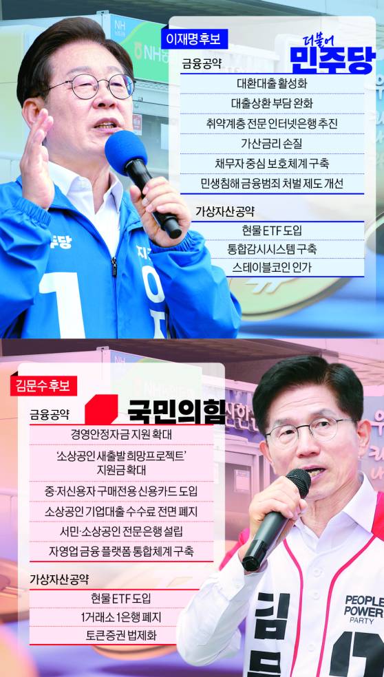이재명 후보는 가상자산 현물 ETF 도입, 거래 수수료 인하, 통합감시시스템 구축 등을 디지털자산 공약으로 발표했다. 김문수 후보는 1거래소 1은행 체제 폐기와 함께 가상자산 현물 ETF 거래 허용, 토큰증권(STO) 법제화 완성, 디지털자산 육성 기본법 제정 등을 제안했다.