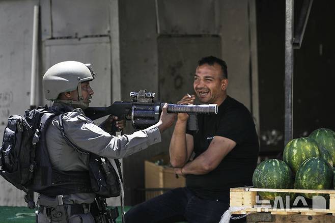 [나블루스=AP/뉴시스] 20일(현지 시간) 요르단강 서안지구 나블루스 인근 아스카르 난민캠프에서 이스라엘군의 기습 작전이 벌어진 가운데, 한 이스라엘 국경 경찰이 수박 노점 옆에 자리를 잡고 있다. 2025.05.21.
