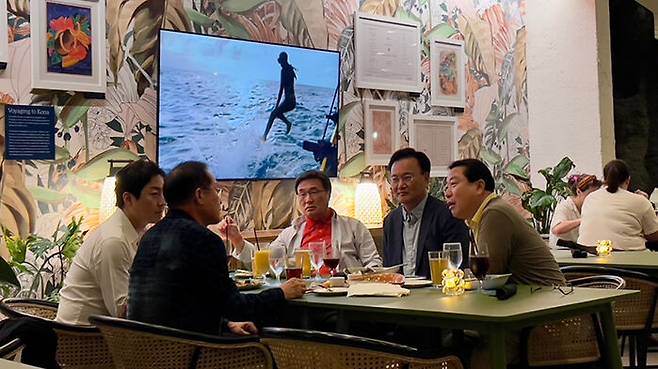 ▲ 국민의힘 대선 선대위 유상범 단일화추진본부장, 김대식 대외협력본부장, 조광한 대외협력부본부장, 이성배 선대위 대변인이 19일 홍준표 전 대구시장의 선대위 합류를 설득하기 위해 미국 하와이에 도착, 홍 전 시장을 만나고 있다.