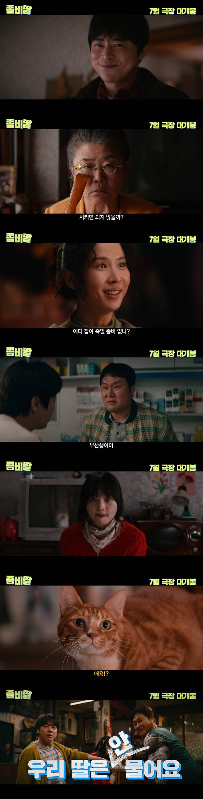'좀비딸'은 이 세상 마지막 남은 좀비가 된 딸을 지키기 위해 극비 훈련에 돌입한 딸바보 아빠의 이야기를 그린 작품이다. 조정석, 이정은, 조여정, 윤경호, 최유리 등이 출연했고 '인질'의 필감성 감독이 메가폰을 잡았다. 오는 7월 개봉 예정.
