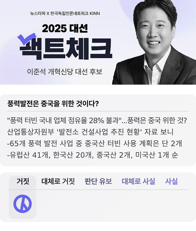 <살아지구>의 검증 결과, 국내 풍력발전 계획에서 한국 업체 터빈의 점유율이 낮은 건 사실이다. 그렇다고 풍력발전이 중국을 위한 정책이라는 이준석 후보의 발언 또한 사실이 아니었다.
