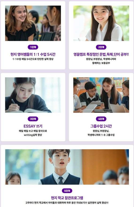 로얄아카데미 어학원은 초등학생을 위한 영어캠프부터 연령별 맞춤 어학연수 프로그램까지 폭넓은 선택지를 제공하고 있으며, 모든 과정에 실전 영어 학습을 핵심으로 포함시키고 있다. 1:1 맞춤 수업과 더불어 매일 에세이 작성이 포함된 프로그램은 학생 개개인의 실력과 흥미에 맞춘 효과적인 학습을 가능하게 하며, 영어를 더 이상 두려운 대상이 아닌, 자연스럽게 활용할 수 있는 언어로 받아들이게 만든다.