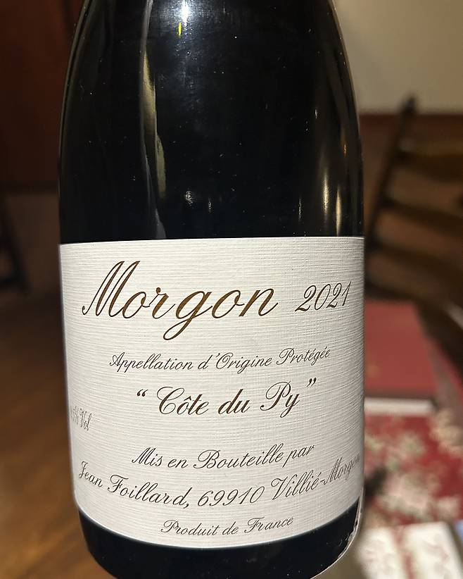 Domaine Jean Foillard Morgon Côte du Py 2021. 프랑스 보졸레 지역을 대표하는 내추럴 와인으로, 생산자인 장 포이야드(Jean Foillard)는 1980년대 보졸레에서 내추럴 와인 운동을 이끈 'Gang of Four'의 일원으로 잘 알려진 인물이다. 포도는 모르공(Morgon) 지역의 일급 포도밭 '코트 뒤 피(Côte du Py)'에서 재배되었으며, 내추럴 와인 가운데서도 상대적으로 브렛 향이 심하지 않다고 평가받는다.