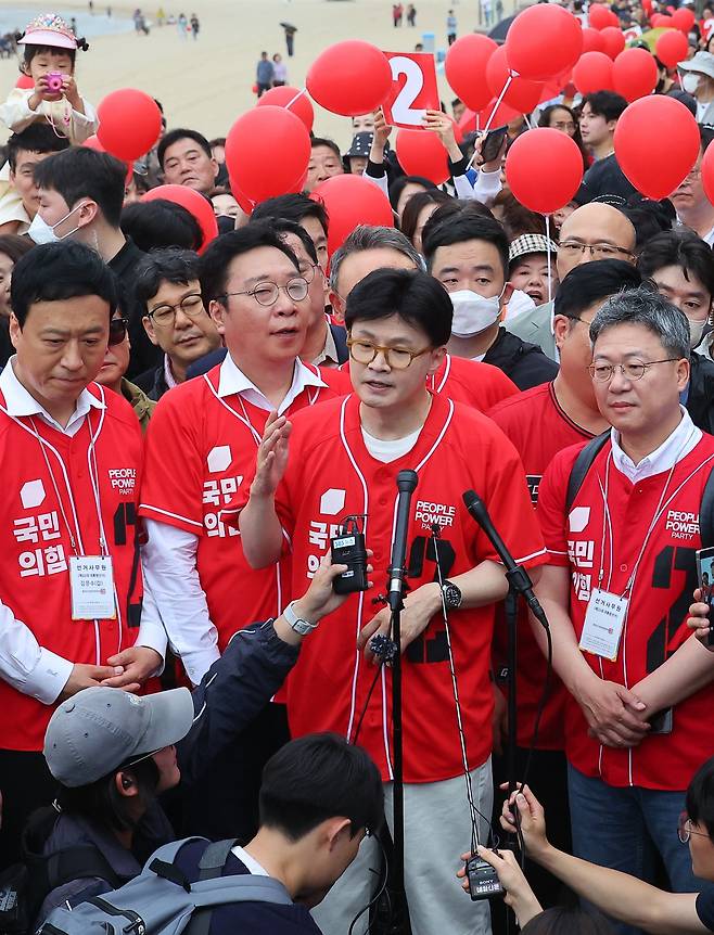 | ▲ 첫 현장유세 나선 한동훈 한동훈 전 국민의힘 대표가 20일 오후 부산 수영구 광안리해수욕장을 찾아 취재진 질문에 답하고 있다. 한 전 대표는 공식선거운동 이후 이날 첫 현장유세에 나섰다. |