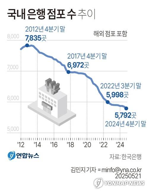 (서울=연합뉴스) 김민지 기자 = 21일 한국은행 경제통계시스템에 따르면, 지난해 4분기 말 국내 은행 점포 수(해외 점포 포함)는 총 5천792곳으로, 전 분기 말보다 57곳 줄었다.
