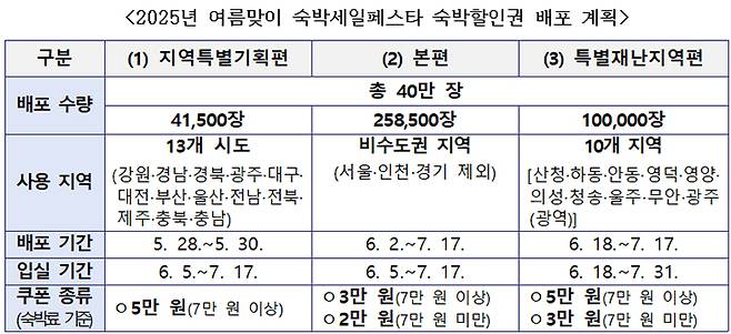 이번 '숙박세일페스타'행사에서는 13개 광역 지자체와 함께하는 '지역 특별기획편'을 비롯해 비수도권 지역 숙박시설을 대상으로 하는 '본편', 산불 피해 및 12·29 여객기 참사 '특별재난지역편' 등 숙박할인권 총 40만 장을 배포한다.