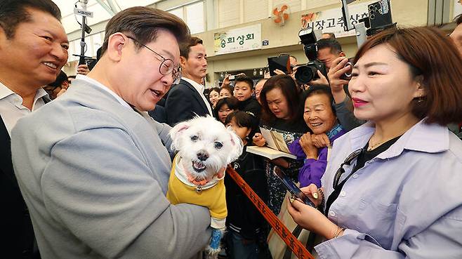 ▲ 남도문화벨트 골목골목 경청투어에 나선 더불어민주당 이재명 대선 후보가 지난 11일 전남 강진군 강진읍 강진오감통시장을 찾아 한 지지자의 반려견을 품에 안고 인사를 하고 있다.