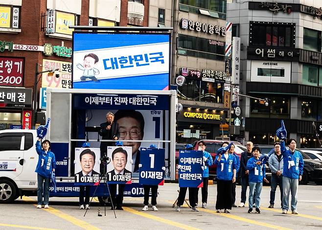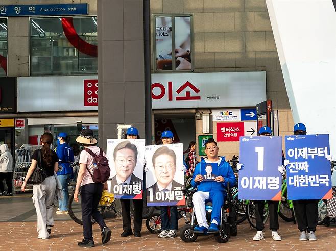 | ▲ 20일, 안양역에서 이재명 후보 지지자들의 유세 “안녕하십니까, 기호 1번 이재명입니다.”라고 외치는 피켓을 든 사람들을 만났다. 더불어민주당 안양 만안구 지역 대의원 류호상씨가 전동휠체어를 타고 유세 중이다. |