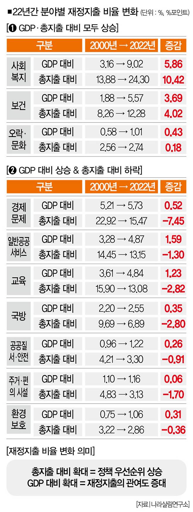 사회복지 분야 재정지출은 GDP 대비 5.86%포인트, 총지출 대비 10.42%포인트 상승했다(이하 2000년 대비 2022년). 보건 분야는 GDP 대비와 총지출 대비 각각 3.69%포인트와 4.02 %포인트, 오락ㆍ문화 분야는 각각 0.43%포인트와 0.18%포인트 올라갔다.