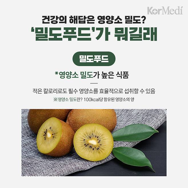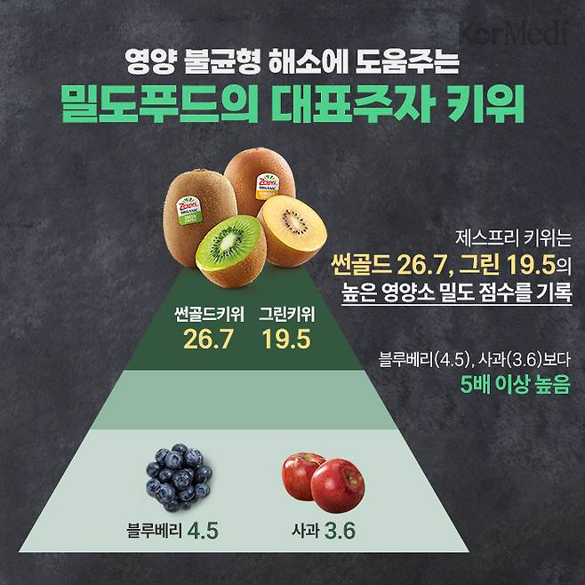 밀도푸드 중에서도 단연 돋보이는 것은 키위다. 제스프리 키위는 썬골드 26.7, 그린 19.5의 높은 영양소 밀도 점수를 기록하며 영양소 밀도가 높은 대표 과일로 주목받고 있다. 우리가 흔히 '건강에 좋다'고 여기는 블루베리(4.5)나 사과(3.6)보다 5배 이상 높다. 키위 한 알에 비타민C, 칼륨, 식이섬유, 엽산, 비타민E를 포함한 20가지 천연 비타민과 미네랄이 빈틈없이 함유돼 있다.