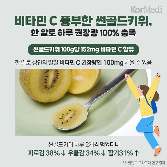 특히 썬골드키위는 비타민C 함량이 풍부하다. 썬골드키위 100g당 152㎎의 비타민C를 함유하고 있어 1개만 먹어도 성인 기준 하루 비타민C 권장 섭취량(100㎎)을 충족한다. 뉴질랜드 오타고 대 연구진의 실험에 따르면 제스프리 썬골드키위 2개를 4주간 매일 섭취한 참가자들은 비타민 C 수치가 증가했고 면역세포가 활성화됐다. 피로감은 38%, 우울감은 34% 감소한 반면 활기는 31% 증가했다.