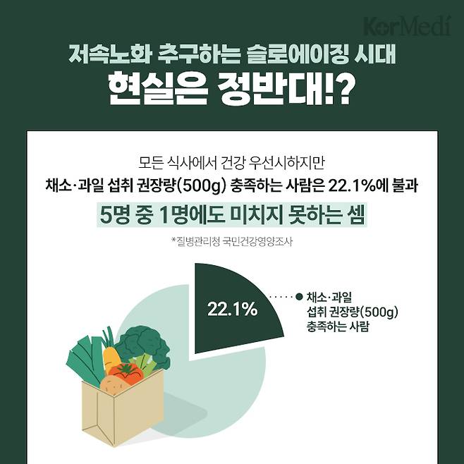 자기 주도적으로 필요한 영양을 균형있게 보충하려는 노력과 달리 현실은 녹록지 않다. 질병관리청 국민건강영양조사에 따르면 한국인의 하루 채소·과일 섭취 권장량은 500g이지만 이를 충분히 섭취하는 사람은 22.1%로, 5명 중 1명도 채 되지 않는 수준이다.
