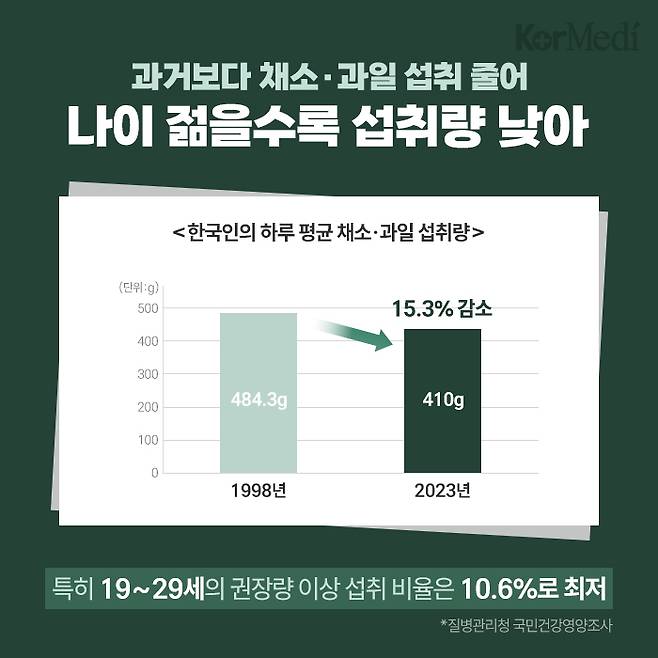 또한, 같은 조사 결과 한국인의 하루 평균 채소·과일 섭취량은 1998년 484.3g에서 2023년 410g으로 15.3% 감소했다. 특히 19~29세의 경우 하루 권장량 이상 과일·채소를 섭취하는 비율은 10.6%에 그쳤다. 젊을수록 채소와 과일 섭취가 부족한 것이다.