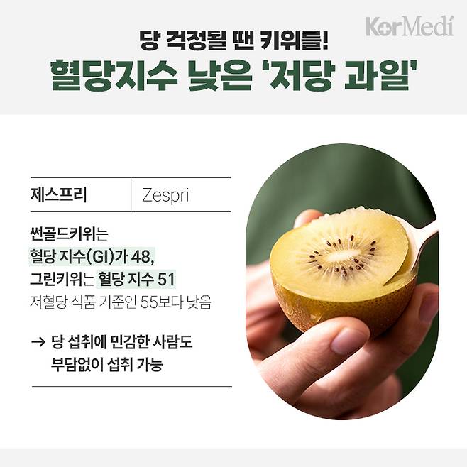 키위는 혈당지수가 낮은 저당 과일로도 주목받는다. 그린키위와 썬골드키위는 각각 혈당지수가 51과 48로, 저혈당 식품 기준치(55 미만)에 해당한다. 당 섭취에 민감한 소비자도 부담 없이 즐길 수 있다.