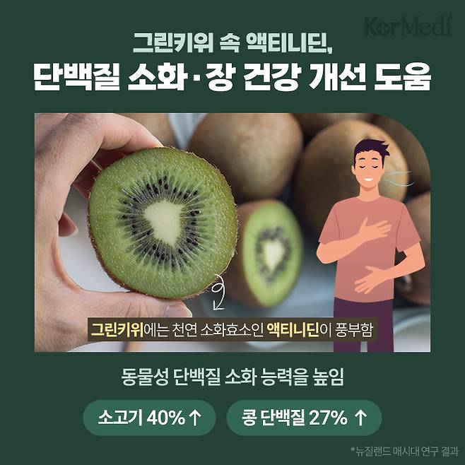 그린키위도 뛰어난 건강 효능을 지닌다. 그린키위 속 천연 소화효소 '액티니딘' 성분은 단백질 소화를 돕고 장 건강을 개선하는 데 효과적이다. 뉴질랜드 매시대 연구진은 그린키위의 액티니딘이 동물성 단백질 소화율을 40%, 콩 단백질은 27%까지 높인다고 밝혔다. 그린키위와 썬골드키위는 호주 모나쉬대에서도 인정한 저포드맵 식품으로, 과민성대장증후군 완화에도 도움을 준다.