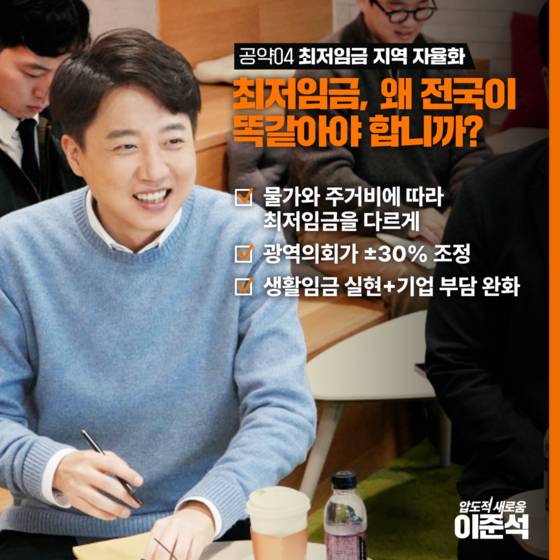 이 후보는 지역별 물가와 주거비에 맞게 최저임금을 조정하자며 최저임금 지역 자율화 정책을 공약했습니다. 중앙정부가 기준 임금만 정하고, 지자체와 지방의회가 협의해 기준 임금의 ±30% 범위 안에서 지역 최저임금을 결정하게 하자고 했습니다. 이러면 물가 수준이 비교적 낮은 지방 지역에선 최저임금을 낮추는 방식으로 기업 유치 경쟁에 나서고 소상공인의 과도한 부담도 덜 수 있다는 취지입니다.