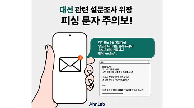 안랩은 '대선 관련 설문조사'를 사칭한 피싱 문자 정황을 포착했다며 오늘(21일) 주의를 당부했습니다.