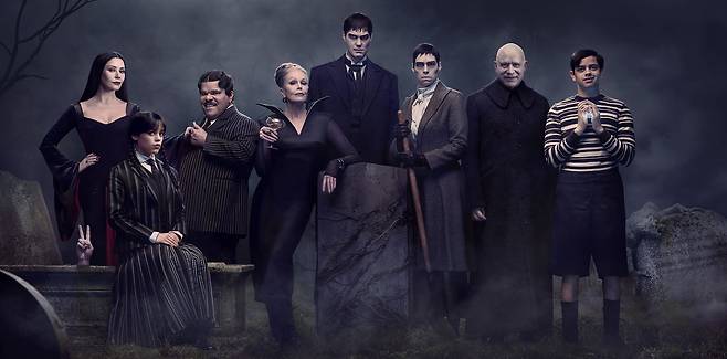 관련 콘텐츠가 베일을 벗었다. '아담스' 패밀리 사진을 오픈했다. 웬즈데이(제나 오르테가 분)의 가족들이 한 자리에 모였다.