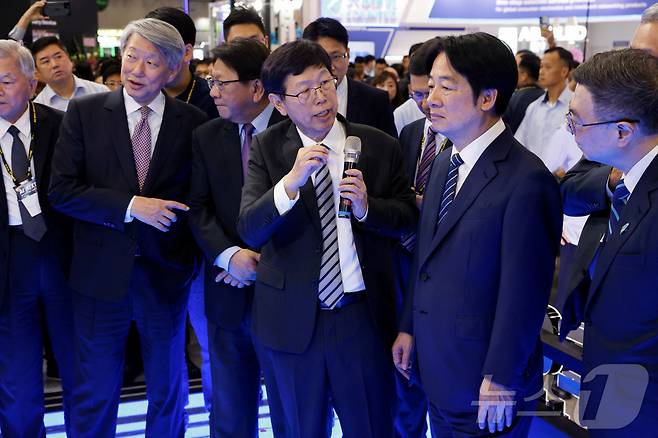 (타이베이 로이터=뉴스1) 우동명 기자 = 라이칭더 대만 총통이 20일 (현지시간) 타이베이 난강 전시관에서 열린 '컴퓨텍스 2025'에 참석해 류양웨이 폭스콘 회장과 얘기를 하고 있다. 2025.05.21