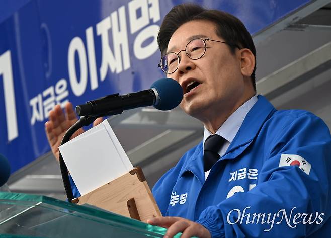 | ▲ 이재명 더불어민주당 대선 후보가 13일 경북 포항시 포항시청 광장에서 유권자들에게 지지를 호소하고 있다. |