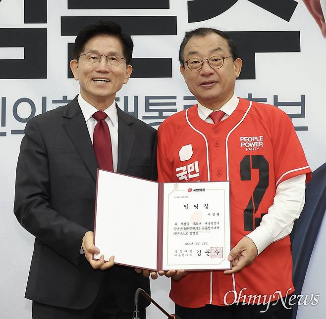 | ▲ 김문수 국민의힘 대선 후보가 15일 오전 서울 여의도 국회에서 열린 중앙선대위 회의 및 중앙선대위 임명장 수여식에 이정현 공동선대위원장에게 임명장을 수여한 뒤 기념촬영을 하고 있다. |