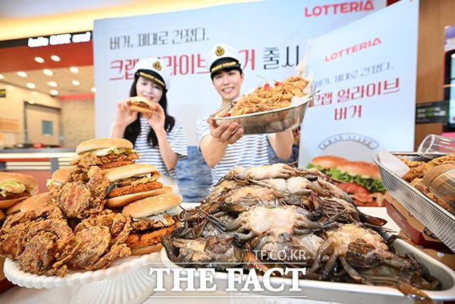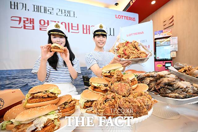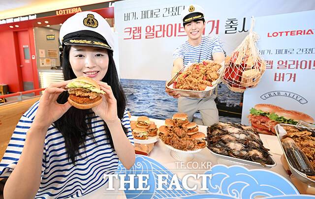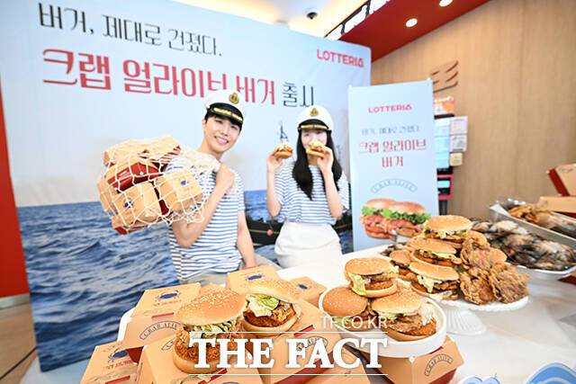 [더팩트ㅣ서예원 기자] 롯데GRS(대표이사 차우철)의 버거 프랜차이즈 롯데리아가 21일 오전 서울 중구 롯데리아 동대문역사문화공원역점에서 신메뉴 '크랩 얼라이브 버거' 출시 기념 행사를 진행한 가운데 모델들이 포즈를 취하고 있다.