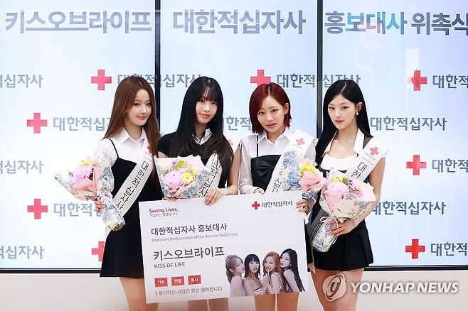 (서울=연합뉴스) 진연수 기자 = 대한적십자사 청소년적십자(RCY) 홍보대사로 위촉된 그룹 키스오브라이프가 21일 오전 서울 중구 대한적십자사 서울사무소에서 열린 홍보대사 위촉식에서 기념촬영을 하고 있다. 2025.5.21