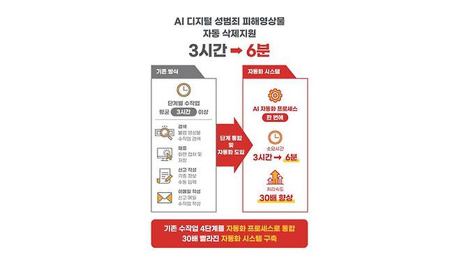 기존에는 삭제지원관이 수작업으로 피해 영상물을 채증하고, 보고서를 작성해야 했으나, 전 과정을 'AI 자동화'해 처리 속도가 대폭 향상됐습니다.