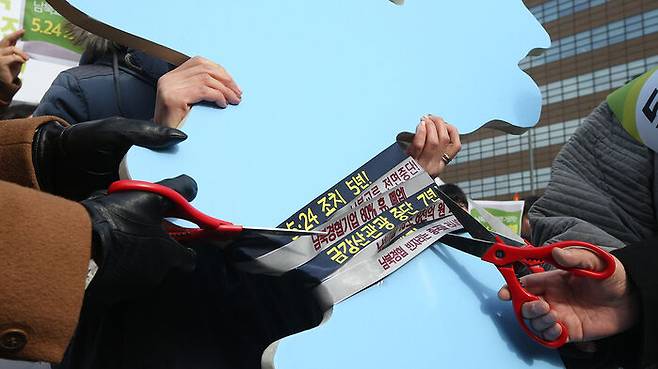 ▲ 지난 2015년 '5·24 조치 해제를 위한 경협·종교·시민단체 연대' 소속 회원들이 5·24조치 해제와 금강산 관광을 재개할 것을 촉구한 뒤, 이를 상징하는 퍼포먼스를 하고 있는 모습