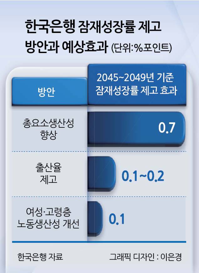한은은 ▷총요소생산성 향상 ▷출산율 제고 ▷여성·고령층 노동생산성 개선 등이 성공적으로 달성될 경우, 2040대 후반(2045∼2049년) 잠재성장률은 기존 전망보다 각각 0.7%포인트, 0.1∼0.2%포인트, 0.1%포인트 높아질 것이라고 분석했다.