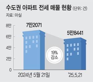부동산 플랫폼 아실에 따르면 21일 현재 수도권 아파트 전세 매물은 5만8441건으로 1년 전(7만2071건)보다 약 19% 감소했다. 경기도에서는 1년 새 전세 물량이 1만 건 가까이 실종됐다.