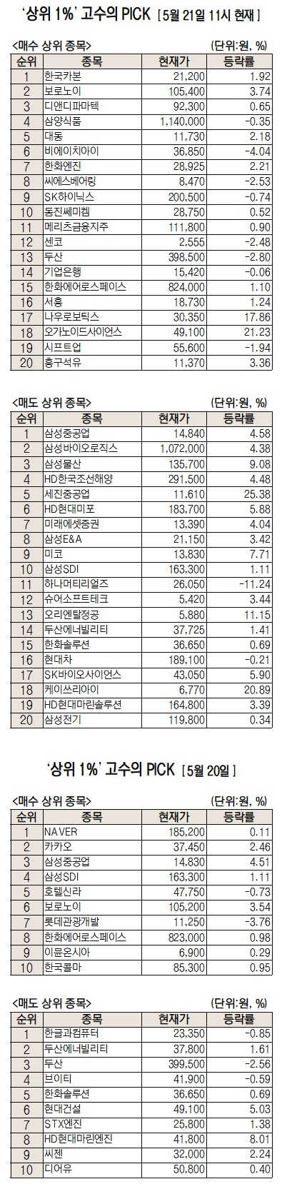 이날 미래에셋증권에 따르면 미래에셋증권 주식 거래 고객 중 최근 1개월간 투자수익률 상위 1%에 해당하는 ‘주식 초고수’들이 오전 11시까지 가장 많이 사들인 종목은 한국카본이다.